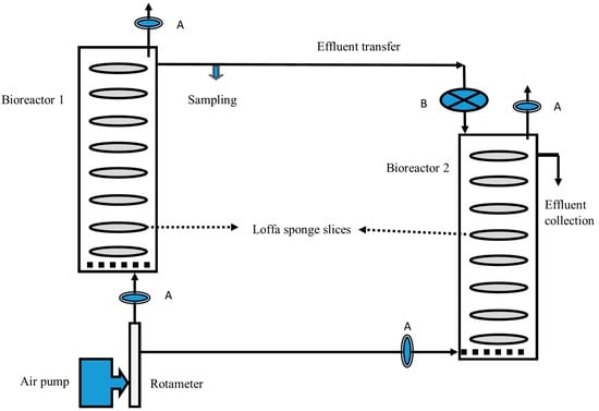 Schematic diagram of the two-stage process for simultaneous cellulase enzyme and citric acid production employing loofa sponge-packed column bioreactors. A: Air filters; B: Glass wool depth filter.