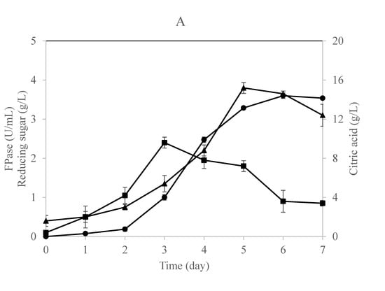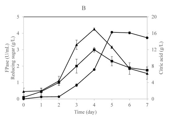 The time profile for this fermentation process using a single-stage column bioreactor is shown in Figure 2A,B. The results indicate that the fungus secreted cellulases during the early stages of growth irrespective of the citric acid that started to accumulate in the culture throughout the late stages of the process. This result is in agreement with previous studies claiming that citric acid would accumulate in the culture after 72 h of incubation and a further incubation period would result in a decrease of citric acid formation [,]. Papanikalaon et al. [] claimed that citric acid production is a non-growth coupled process using Y. lipolytica cultivated on OMW-based media.