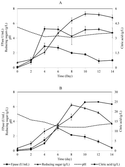 Time profile for the two-stage loofa sponge-packed column bioreactors for the simultaneous production of cellulase, citric acid, and reducing sugars by A. niger utilizing OMW supplied with 1% cellulose. (A) First-stage process; (B) second-stage process. Error bars represent the standard error of the mean values.