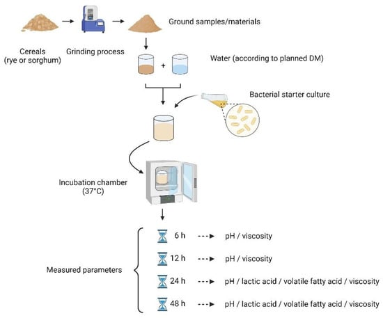 The ground grains (rye or sorghum) of both 1 and 10 mm (mixed) were fermented in vitro by using a 300 mL sterile beaker. Briefly, the sample-to-water ratio was adjusted to achieve the planned DM contents (25%, 37.5%, 50%, 62.5%, and 75%) in the mixture before fermentation. To avoid malfermentation, a freeze-dried, granulated starter culture (Schaumalac Feed Protect XP G, H. Wilhelm Schaumann GmbH, Pinneberg, Germany), consisting of 1k2079 Lactobacillus plantarum, 1k2103 Pediococcus pentosaceus, and 1k2082 Lactococcus lactis was added at the beginning of each fermentation process at a dose of 2 × 107 CFU/g ingredient. The beakers were anaerobically (CO2 = 10.0%, O2 = 0.2%, N = 89.8% and temperature = 37.0 °C) incubated (Binder-Anaerobier Incubator, Fa. BINDER GmBH, Tuttlingen, Germany) for 6 h, 12 h, 24 h, and 48 h (Figure 1).