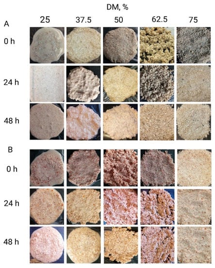 Macroscopic appearance of fermented rye (A) and sorghum (B) according to DM content before fermentation and time of fermentation. (Figure was created with BioRender.com at 22 December 2021).