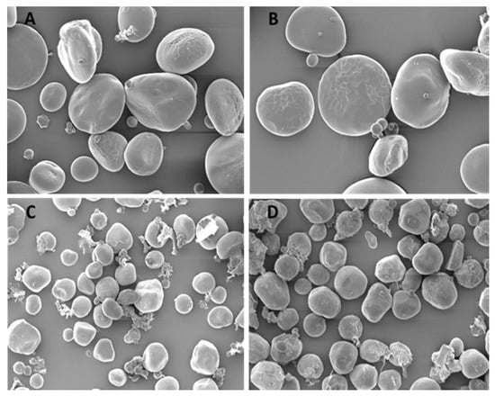 Scanning electron microscope images (×1000) of starch granules in (A) = unfermented, (B) = fermented rye with 37.5% DM content, and (C) = unfermented, (D) = fermented sorghum with 37.5% DM content. Differentiation of starch granules into two main size categories was apparent. The morphology of the rye starch granule varied from large-oval to small-irregular in shape, without any pores. Less matrix material occupying the spaces between starch granules was observed in rye compared to sorghum.