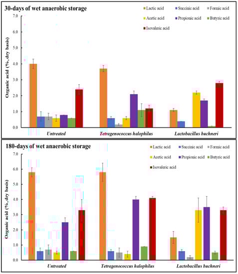 There was no significant difference (p < 0.05) in the dry matter loss recorded for all the algae samples which were anaerobically stored for 180 days, and losses increased only moderately from 30 days. If the same rate of material loss in the first 30 days continued in the next 150 days, losses of 27% could be expected in the L. buchneri inoculated biomass. This decreasing rate of degradation has been previously observed in the ensiling of forage crops, where most of the dry matter loss occurs within the first days and weeks of storage []. Although inoculation with L. buchneri was beneficial for short duration storage, this advantage disappeared with long-term storage, with biomass experiencing the same level of preservation regardless of treatment. This includes the no treatment control, where the stability achieved indicates that sufficient lactic acid bacteria were already present within the algae biomass. This is further supported by the composition of organic acids produced in storage, which will be discussed later. Achieving stabilizing conditions without requiring specialized inoculants will simplify the process of preserving algae biomass at industrial scales.