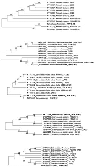 The bacterial cultures were transferred onto disks soaked with N, N, N, N′-tetramethyl-p-phenylenediamine, which did not produce dark-blue/brown color and were regarded as oxidase negative. The bacterial isolates were provisionally molecularly identified based on 16S rDNA sequencing and were categorized into four major groups of LAB: Weissella, Leuconostoc, Lactococci, and Enterococci. The sequence homologies detected through phylogenetic analysis showed that NMCC-M2 was provisionally similar to Weissella confusa; NMCC-M4 revealed 98.29% similarity to Leuconostoc pseudomesenteroides, Lactococcus; NMCC-M5 revealed 99.90% similarity to Lactococcus lactis subsp. hordniae; NMCC-M6 revealed provisional similarity to Enterococcus faecium; and NMCC-M7 revealed 100% similarity to Enterococcus lactis.
