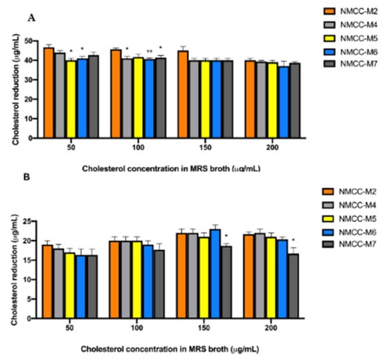 Our results indicate that the cholesterol reduction percentage changes with the variation of cholesterol concentration present in the media; thus, cholesterol concentration plays a pivotal role in cholesterol assimilation. Most tested strains showed higher cholesterol-reducing levels, within the range of 38.0 to 48.00 µg/mL when inoculated in bile salt supplemented MRS broth (p < 0.05) (Figure 2a); however, the cholesterol reduction decreased up to 15.0 to 23.0 µg/mL in media without bile salts (Figure 2b).