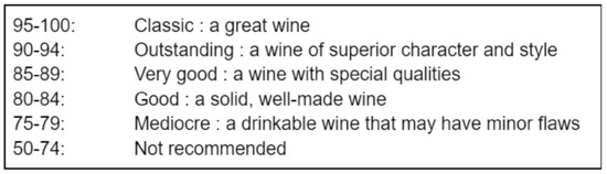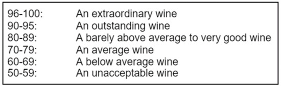 Robert Parker is a world-renowned wine critic. A high score from Robert Parker can rapidly grow a wine’s reputation, as well as its price [21]. He assigns grades to wines based on the aroma, taste, and all of the other characteristics on a scale of 50–100 [15]. Robert Parker’s 100-point rating system (Figure 1) is one of his most influential and controversial conceptions [22].