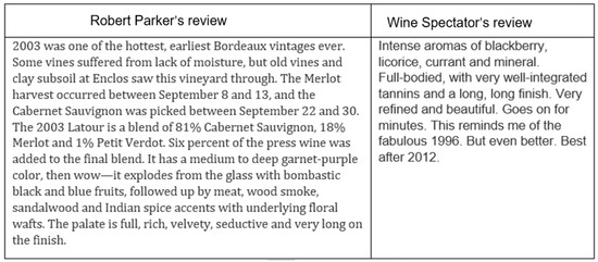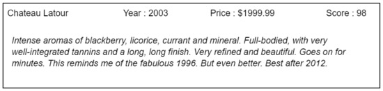 The reviews of Wine Spectator and Robert Parker also are quite different. Wine Spectator’s reviews tend to be a simpler and more formal expression, while Robert Parker’s reviews are much more descriptive and detailed. For example, Wine Spectator’s review of Chateau Latour of 2003 in Figure 3 has 39 words in total, while Robert Parker’s review of the same wine in Figure 4 has 125 words in total. In Figure 3, the review is mostly focused on describing the characteristics of the wine, such as “intense aromas, full-bodied”; in Figure 4, the review provides information regarding not only wine characteristics but also wine-related features, such as “some vines suffered from lack of moisture”. Wine Spectator’s review is more similar to a wine specification, while Robert Parker’s review is more similar to an encyclopedia.