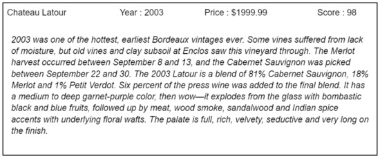 The attribute vocabulary of the computational wine wheel was collected from the reviews in Wine Spectator. To observe the application of the computational wine wheel to a new source, Robert Parker’s reviews, checking the efficiency of the attribute extraction is essential. This step was conducted to compare the differences between the attributes extracted from the CWW and by hand. Figure 7 shows a concrete example of a wine review of the 2016 Mouton Rothschild wine from Robert Parker used in the analysis.