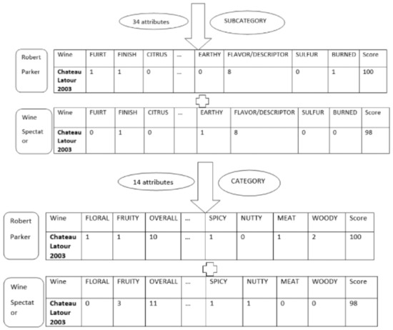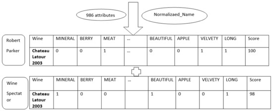 In Figure 5, there are two wine reviews: the left one is Robert Parker’s review, and the right one is Wine Spectator’s review. The first step is to extract the “SPECIFIC_NAME” attributes in the wine review and then assign the corresponding “NORMALIZED_NAME” attributes to 1. The lower portion of Figure 5 is the outcome of the first step. A total of 16 attributes were extracted from Robert Parker’s review, while a total of 14 attributes were extracted from Wine Spectator’s review.