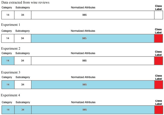 The results of applying the SVM to the five-fold data are presented in this section. Since there are three different sets of attributes, namely, normalized values, category values, and subcategory values, the input data were prepared differently for four different experiments based on the methodology used in [16] to maximize the power of the computational wine wheel. The first experiment used wine reviews with only “NORMALIZED_NAME” attributes, resulting in a binary dataset with 985 attributes, which is similar to that used in most previous studies [10,11,12]. The second experiment used reviews with only “CATEGORY” attributes, resulting in a continuous dataset with 14 attributes. The third experiment used reviews with both “NORMALIZED_NAME” and “CATEGORY” attributes, resulting in a mixed dataset with 999 attributes, and it gave the best results in [16]. The fourth experiment used reviews with “NORMALIZED_NAME”, “CATEGORY”, and “SUBCATEGORY” attributes, resulting in a mixed dataset with 1034 attributes, which provide all information that can be extracted from the computational wine wheel. Figure 8 shows a breakdown of what is contained in each dataset, with a class label at the end. The following subsections use different combinations of attributes to build SVM models for classification evaluation using five-fold cross-validation.