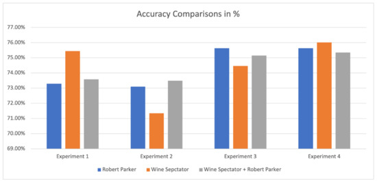 The final experiment used all attributes extracted from the computational wine wheel. This experiment was used to evaluate if having more details can lead to better results. In Table 6, it can be seen that almost all of the results are better than or compatible with those of other experiments. Wine Spectator’s dataset achieved the highest accuracy; this is the only accuracy that is higher than 76%, which means that having more details leads to a more accurate result. Both the results of Robert Parker and those of the combination increased by about 2%, which means that improving Robert Parker’s accuracy could affect the combination’s accuracy.