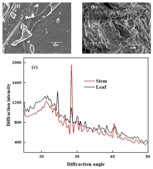 SEM images of sweet potato stem (a), sweet potato leaf (b), and the XRD spectrogram of stem and leaf (c).