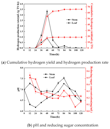 It can be seen from Figure 2a that the hydrogen production rate and cumulative hydrogen yield trends of stem and leaf were basically the same. Within 24–60 h, CHY increased sharply, and the peaks of HPR appeared at 48 h, which were 3.33 mL/(g TS·h) and 0.9 mL/(g TS·h), respectively. The CHY and highest HPR of stem were 66.03 mL/g TS and 3.33 mL/(g TS·h) higher than those leaf. In previous studies, Fan et al. added tea saponin to improve PFHP performance, and the maximum CHY was 58.97 mL/g TS [22]. Thus, stems have potential as PFHP substrates. After 60 h, the PFHP from leaf ceased, while the hydrogen production process stopped at 84 h, which may have been due to the stem producing more reducing sugars, and the reducing sugars were usefully employed in hydrogen production. Related speculations were verified by the determination of pH and reducing sugar concentration.