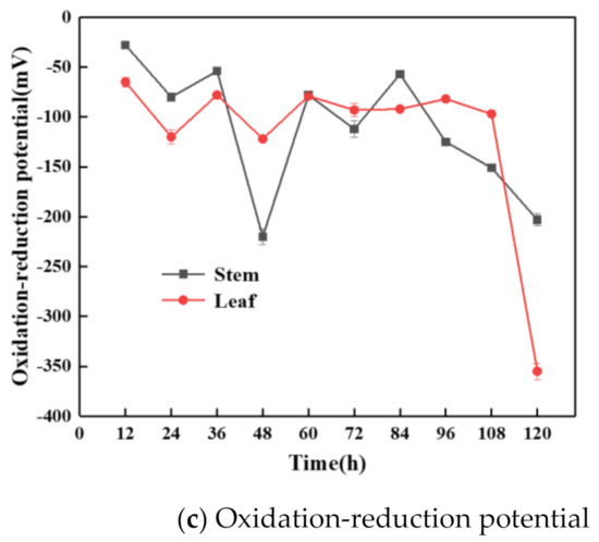 Figure 2c shows the ORP changes in the process of PFHP from stem and leaf. It can be seen that the ORP fluctuated slightly in the first 36 h, indicating that bacteria were mainly growing and reproducing at this stage. Within 36 to 60 h, PSB growth and metabolism were vigorous, and the reducing sugar in the fermentation broth was consumed to produce a large amount of reducing power, which resulted in a rapid reduction of ORP. As the fermentation continued, the ORP had an upward trend; it may be that the PSB entered a stable phase from the logarithmic growth phase. The growth and metabolism rate of PSB were slow, and the produced reducing power was used to produce a large amount of hydrogen. In the later stage of fermentation, the overall ORP showed a decrease, because a large number of metabolic inhibitors were produced in the fermentation broth, and the concentration of the available substrate was reduced. Hence, the hydrogen-producing microorganisms gradually decayed, PSB died, and the PFHP process ceased.