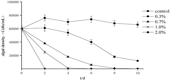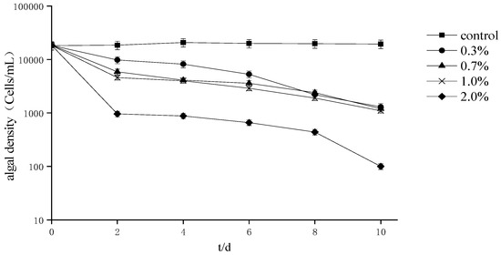 The effect of different fermentation broth amounts on the growth of A. tamarense (Figure 1) indicates that the cell density decreased with the extension of the treatment period and that the 0.3% treatment group variability trend was relatively gentle compared to that of the other treatment groups. In addition, after 10 days of culture, the inhibition rate of each treatment group was greater than 98%.