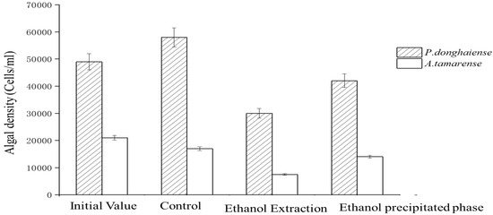 The microbial fermentation liquid was added to 40 mL of liquid containing P. donghaiense and A. tamarense at volume ratios of 0.3%, 0.7%, 1.0%, and 2.0%. The untreated control group was shaken by hand twice a day, placed in a light incubator for 10 days and counted every 2 days under a microscope. Each group analyzed consisted of three replicates.