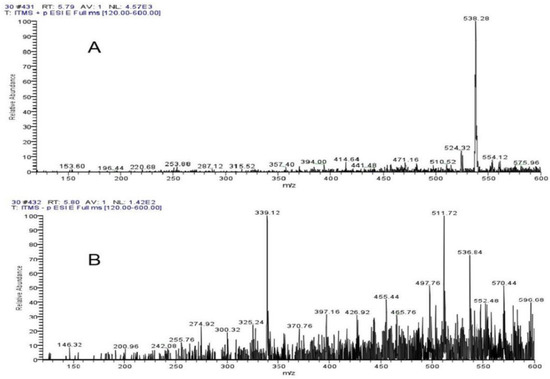 Mass Spectrogram analysis showed (A) 538.28 positive ions and (B) 536.84 negative ions at 5.39 min.