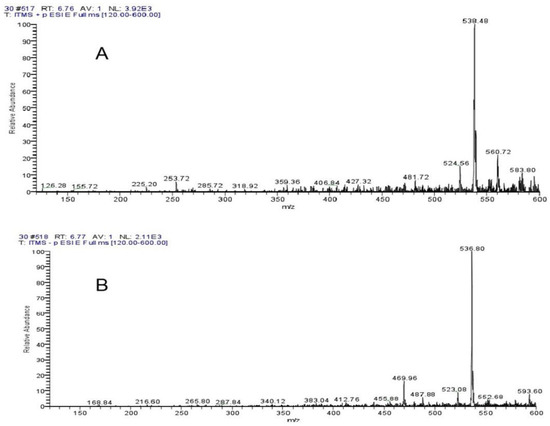 Mass Spectrogram analysis showed (A) 538.48 positive ions and (B) 536.80 negative ions at 6.20 min.