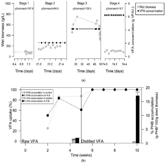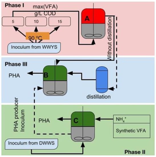 Research over the past 15 years on PHA production at a laboratory scale using mixed microbial culture has mainly consisted of a three-step process involving: (1) VFA production from acidogenic fermentation, (2) biomass production of a microbial-mixed culture with superior capability to produce PHA and (3) PHA production []. VFA has been obtained from the anaerobic transformation of a wide range of organics wastes including: olive and palm oil, sugar molasses and vinasses [], starch, and glycerol from the biodiesel industry [], and industrial and domestic wastewaters [,].