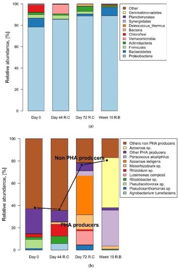 The evolving composition of the microbial community of reactors C and B was elucidated using 16S RNA pyrosequencing (Figure 3). Bacterial species reported in the literature as PHA producers and extracellular PHA decomposers were identified. Proteobacteria had the highest relative abundance (Figure 3a), representing between 78 and 88% of the phyla identified in the samples from reactor C; meanwhile, in reactor B, it had an abundance of 88%. The most abundant classes on day 72 of reactor C were Alpha and Beta proteobacteria, covering 30 and 35% of the relative abundance, respectively. These two classes were also the most abundant in reactor B, with a relative abundance of 42% and 45%, respectively. These results agree with those obtained by Queirós et al. [], which obtained a PHB-producing culture from an activated sludge originating from a wastewater treatment plant using hardwood spent sulfite liquor timber as a substrate. The authors explored the microbial community using fluorescence in situ hybridization (FISH) and observed that the most abundant classes were identified as Alpha-(72.7 ± 4%) and Beta-(11.1 ± 0.37%).