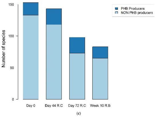 PHA-producing microorganisms can be selected by using cycles with a phase of carbon excess followed by a phase of carbon depletion in the substrate. There was a reduction in the total number of species of reactor C which began with 153 species on day 0 and ended with 98 on day 72. Furthermore, the number of total species on week 10 of reactor B was 83. The number of PHB-producing species on day 72 of reactor C and week 10 of reactor B were 25 and 18, respectively (Figure 3c). The relative abundance of PHA-producing bacteria increased from 37% to 78.52% between days 0 and 72 of operation of reactor C, whilst in reactor B, the bacterial group presented an enrichment of 83% (Figure 3b).