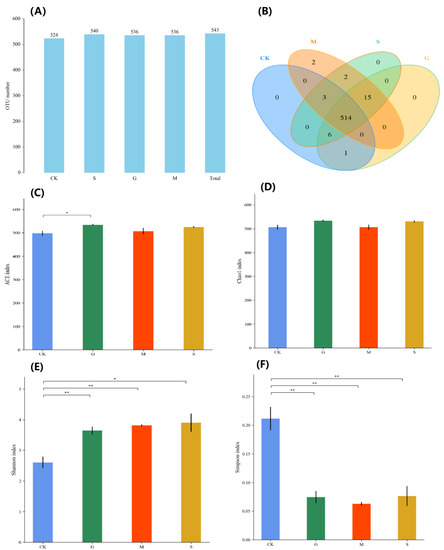 Venn analysis of OTUs and alpha-diversity of the bacterial community of stylo silage. ‘*’ and ‘**’ represent p < 0.05 and p < 0.01, respectively. CK, control; S, sucrose; G, glucose; M, molasses.(A) OTUs number of the bacterial community of stylo silage; (B) Venn analysis of OTUs in the bacterial community of stylo silage; (C–F) the ACE, Chao1, Shannon and Simpson index of the bacterial community of stylo silage, respectively.