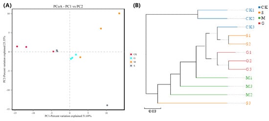 Beta-diversity of bacterial community of stylo silage. CK, control; S, sucrose; G, glucose; M, molasses.(A) PCoA and UPGMA (B) analysis of bacterial community of stylo silage.