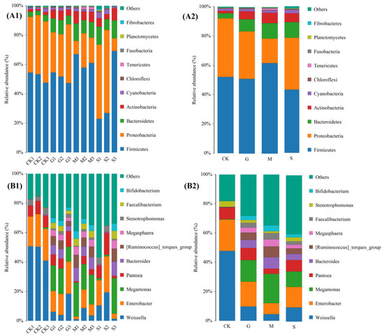 The bacterial abundance at the levels of phylum and genus in stylo silage. (A1) Relative abundance of bacteria at the phylum level of each sample; (A2) Relative abundance of bacteria at the phylum level of each group. (B1) Relative abundance of bacterial at the genus level of each group; (B2) Relative abundance of bacteria at the genus level. CK, control; S, sucrose; G, glucose; M, molasses.