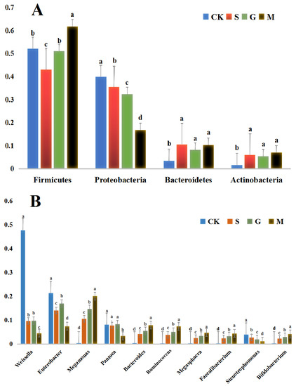 Effects of sucrose, glucose and molasses on the relative abundance of bacterial (A) in the most dominant phylum and (B) genus in stylo silage. Error bars represent the SD of three samples. Boxes with a different letter above the error bars are significantly different at p < 0.05. CK, control; S, sucrose; G, glucose; M, molasses.