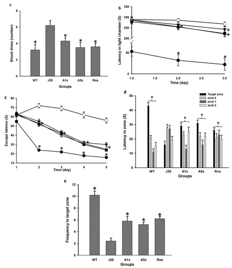 The behavior, learning, and memory schedule of the animal experiment occurred during weeks 7–8. Passive or active avoidance fear conditioning with MWM is often used in animal behavioral testing, in which animals rely on different motor and sensory abilities; these tests can be performed reliably on the same animal [17]. The passive avoidance test was applied in this study to evaluate the development of fear memory in mice. During the shock training, untreated J20 mice received significantly more shocks than the WT mice, indicating that J20 mice had impaired fear memory. Figure 1a shows the number of times that each group was subjected to electrodes during the second day of electric shock training. It can be found that the average number of electric shocks in the J20 group was about six times, which is significantly higher than that in the wild-type control group. It is inferred that the J20 mouse has a difficult memory formation in terms of avoiding the dark room. Conversely, mice in the A1x, A5x, and Ros groups displayed significantly lower numbers of shocks than those in the J20 group, with performance comparable to WT animals (Figure 1a). Thus, A1x, A5x, and Ros treatment in the setting of APP overexpression appeared to restore normal fear memory development compared with untreated J20 mice. As shown in Figure 1b, 3-day consecutive memory trials following shock training showed significantly reduced light compartment latency times for untreated J20 mice compared with WT mice, especially over repeated attempts. This indicates that MPFP slightly improved learning and memory in the J20 AD mice.