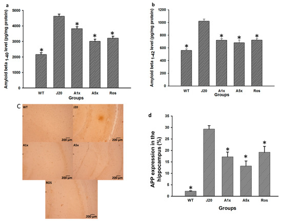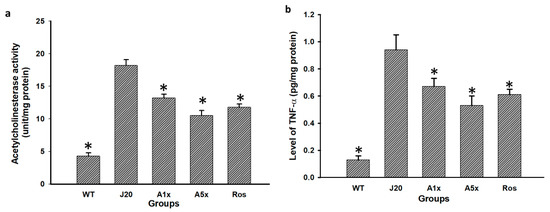 Basal forebrain cholinergic deficit is a consistent feature in AD [18] that is targeted by AChE inhibitor therapy [19]. The brain cholinergic activity was determined by measuring AChE activity. AChE activity was low in WT mice, while untreated J20 mice showed high activity. The hippocampal AChE activities were high in all treated and untreated J20 transgenic mice compared to WT. However, the administration of 1× or 5× MPFP or Ros to J20 mice showed significantly inhibited AChE activity (Figure 3a) compared to untreated J20. MPFP treatment was found the possibility of partially restore cholinergic function.