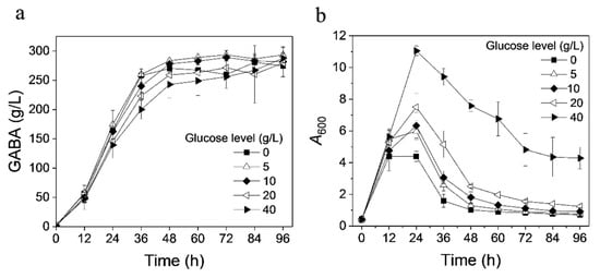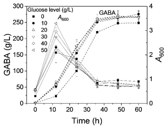 Additionally, the LAB strain examined in this study could grow and produce GABA in a glucose-free medium (Figure 1), indicating that a nitrogen source could also provide some essential carbons for microbial growth. The carbons mainly comprised peptides, amino acids, and nucleotides as the product label indicated. Overall, 5.0 g/L of glucose supported optimal GABA synthesis by L. brevis CD0817, which was lower than that (≥10.0 g/L) required by other strains of L. brevis for efficient GABA production [,,,].