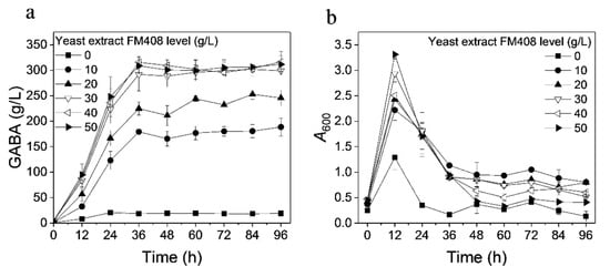 Further analysis indicated an increase in GABA production with increase in yeast extract FM408 concentration from 0 to 30.0 g/L (Figure 2). Although higher concentrations (40.0–50.0 g/L) of yeast extract FM408 increased the cell biomass, it did not increase GABA production further (Figure 2). To guarantee efficient production of GABA, the dosage of yeast extract FM408 was suggested to be 35.0 g/L, slightly higher than 30.0 g/L. The glutamate (1.85 ± 0.05 g/L) introduced by 35.0 g/L of yeast extract FM408 had a minimal effect on the bioprocess.