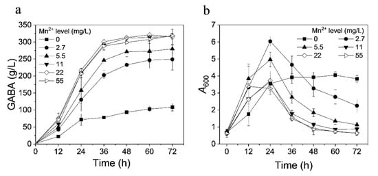 The effects of several compounds including MnSO4, MgSO4, K2SO4, NaCl, CuSO4, ZnSO4, FeSO4, Ba(OH)2, CoSO4, and NiSO4 on the GABA production were individually evaluated. The results demonstrated that only MnSO4 had a positive effect on GABA synthesis (data not shown). Therefore, the effect of MnSO4 concentration on GABA production by L. brevis CD0817 was assessed. As shown in Figure 3a, Mn2+ was an indispensable factor for efficient GABA production. Overall, 11–55 mg/L Mn2+ supported peak GABA production; however, maximal cell growth occurred at 2.7–5.5 mg/L Mn2+ (Figure 3b). We speculated that the high GABA content resulting from 11–55 mg/L Mn2+ may have suppressed cell growth. Compared with the Mn2+-free control, 11–55 mg/L Mn2+ increased GABA production by 2.3-fold. To assure the need of the strain for Mn2+, 16 mg/L (slightly higher than 11 mg/L) of Mn2+ (equal to 50.0 mg/L MnSO4·H2O) was adopted.