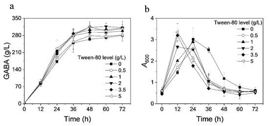As an oleate, Tween-80 is a growth-stimulating factor for LAB strains []. Accordingly, the cell biomass of L. brevis CD0817 increased with increase in Tween-80 concentration in this study (Figure 4b). Increased cell biomass may contribute to GABA production. Moreover, as a non-ionic surfactant, Tween-80 may support oleic acid uptake by cells, which is then converted to cyclopropane fatty acid (a membrane fluidity enhancer) []. These findings indicated that Tween-80 may elevate GABA production by improving cell membrane permeability []. However, further studies should investigate whether Tween-80 can help maintain the acidic pH by promoting glucose metabolism.