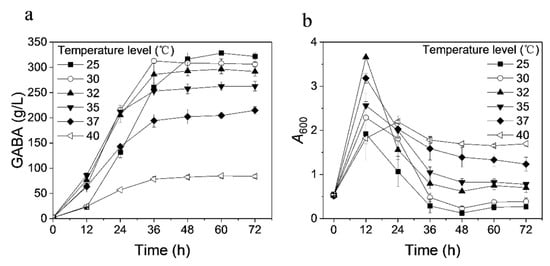 The effect of fermentation temperature on (a) GABA production and (b) cell growth. This was evaluated using a 250 mL Erlenmeyer fermentation flask. Cell growth was expressed as A600. Vertical bars represent standard deviations of means (n = 3). There was no significant difference in 48 h GABA concentration between 25 °C and 30 °C (p = 0.926) or 32 °C (p = 0.136), but there was a significant difference between 25 °C and 35 °C (p = 0.000), 37 °C (p = 0.000), or 40 °C (p = 0.000). GABA, gamma-aminobutyric acid; A600, absorbance at 600 nm.