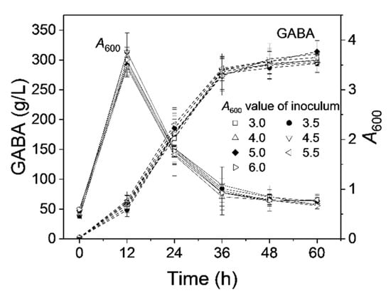 Next, we examined the effect of seed age on GABA production. GABA fermentation was initiated using seeds with A600 values ranging from 3.0 to 6.0 (4.8–9.7 × 108 CFU/mL). The data showed that seed age exhibited marginal effects on either GABA synthesis or strain growth (Figure 7), reflecting flexibility of inoculation.