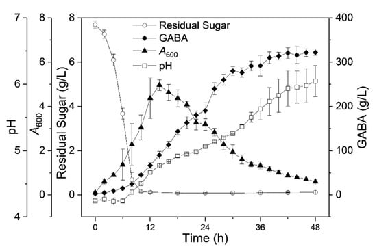 The optimized seed medium contained 25.0 g/L yeast extract, 10.0 mg/L MnSO4·H2O, 28.0 g/L MSG, 2.0 g/L Tween-80, and 10.0 g/L glucose and was maintained at a pH of 5.0. The optimized fermentation medium contained yeast extract (35.0 g/L), MnSO4·H2O (50.0 mg/L), Tween-80 (1.0 g/L), and glucose (5.0 g/L). Just before inoculation, 650 g of sterilized L-glutamic acid solid powder per liter of fermentation medium was added. The seed culture was made as described above. The seed culture (inoculum size, 10%, v/v) was inoculated in a 10 L fermenter containing 3.0 L of the optimized fermentation medium supplemented with 1950.0 g of solid powder L-glutamic acid and incubated at 30.0 °C under constant agitation (50 rpm) for 48 h. The fermenter was equipped with EasyFerm Plus 120 pH electrodes (Hamilton, Bonaduz, Switzerland) and two layers of six-flat-bladed impellers. The fermentation was performed under sealed conditions, and the cover of the fermentation tank was fitted with a silicone pipe to serve as an exhaust for carbon dioxide. The exhaust pipe was submerged in water to prevent air from entering the tank. Samples were aseptically withdrawn every 2 h to determine the GABA and residual sugar content and cell growth. All the samples were stored at −20 °C for further analysis. The experiment was repeated three times.