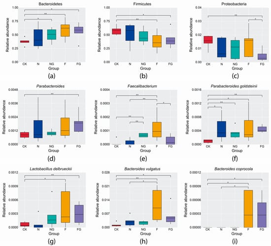 - Wang, M.; Chen, Y.; Wang, Y.; Li, Y.; Zhang, X.; Zheng, H.; Ma, F.; Ma, C.W.; Lu, B.; Xie, Z.; et al. Beneficial Changes of Gut Microbiota and Metabolism in Weaned Rats with Lactobacillus acidophilus NCFM and Bifidobacterium lactis Bi-07 Supplementation. J. Funct. Foods 2018, 48, 252–265. [Google Scholar] [CrossRef]