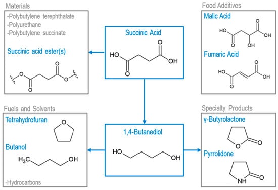 | Succinic Acid | Food additive, chemical precursor for fuels and solvents, pharmaceuticals, polymers and materials, precursor for 1,4-butanediol | USD 2–3/kg | [52,53,54] |