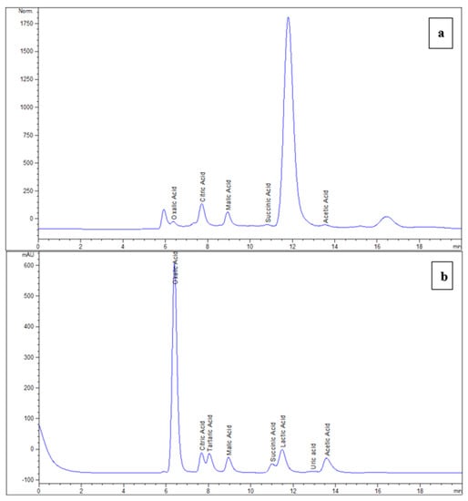 (a) HPLC chromatogram for organic acids of cladode juice (15% v/v) at 210 nm; (b) HPLC chromatogram of organic acid standards mix.