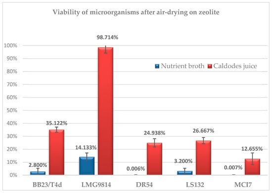 The viability of the bacteria grown on two culture media (cladode juice and NB) after different drying processes was evaluated in order to investigate the potential production of powder formulations for subsequent application in the field. As shown in Figure 2 and Figure 3, a different survival rate was observed among the different bacterial species. B. amyloliquefaciens LMG9814 reached the maximum survival rate, ranging from 14.13% to 98%. Conversely, P. fluorescens DR54 and B. ambifaria MCI7 showed the lowest survival rate and, when grown on nutrient broth, viability after air-drying on zeolite was less than 0.01%. The cell survival rate of A. chroococcum LS132 and R. aquatilis BB23/T4d ranged from 2.69% to 35.12%.