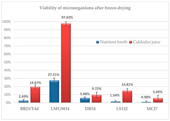 For the freeze-drying process, the liquid culture was centrifuged at 15,000× g for 10 min, and the recovered microbial biomass was suspended in a pasteurized solution consisting of skimmed milk and sodium glutamate (10% and 1%, respectively). Then, 25 mL of the microbial suspension was dispensed in sterile bottles and immediately frozen and freeze-dried using a pilot lyophilizer (Christ, Loc-1M). Further, 1 mL aliquots of bacterial cell suspension were used to check the number of CFU mL−1 before and after the freeze-drying process. For each bacterial strain, the percentage of viability was calculated using the following equation: