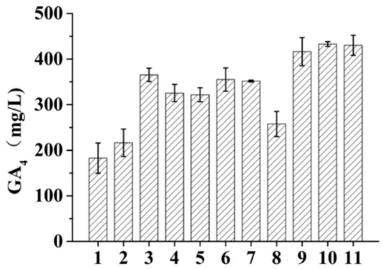 As a slow-acting carbon source, vegetable oil can increase the yield of secondary metabolites. As shown in Figure 1, ten different vegetable oils were selected. The experimental treatments numbered 1–11 were without vegetable oil, canola, soybean, rice, olive, peanut, sunflower, corn, palm, cottonseed, and sesame oils to investigate the effect of 0.25% oil on GA4 production by G. fujikuroi.
