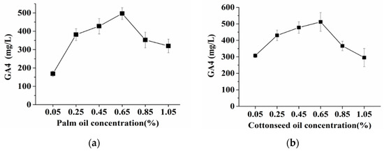 Effect of oil concentrations on GA4 production (a): palm oil, (b): cottonseed oil, (c): sesame oil.