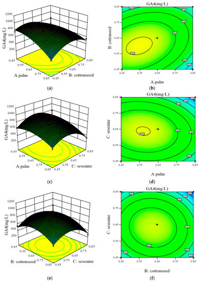 Palm oil (A), cottonseed oil (B), and sesame oil (C) were independent variables, and GA4 (Y) was the response value in BBD. The Box–Behnken experimental design and results are shown in Table 4.