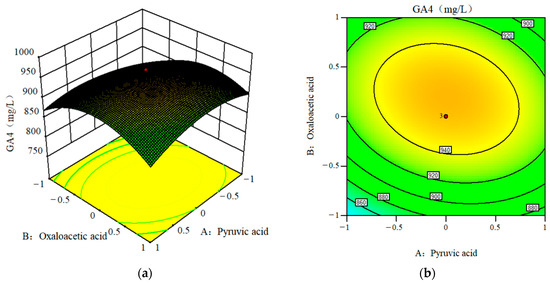 Design-Expert software (version 8.0) was used to obtain three-dimensional response surface plots and corresponding two-dimensional contour plots of the relationship between pyruvic acid, oxaloacetic acid, and citric acid on GA4 production (Figure 4). From Figure 4a,c,e, we observed the downward opening of the response surface, which proves that the model has a maximum value and GA4 has a maximum production. Figure 4d shows that the contour plot of pyruvic acid and oxaloacetic acid on GA4 production is nearly circular, indicating that the interaction between pyruvic acid and oxaloacetic acid has no significant effect on GA4 production. Figure 4b,f show the interactive contours of oxaloacetic acid with citric acid and pyruvic acid with citric acid, respectively. The contours are elliptical, which proves that the interactions between oxaloacetic acid and citric acid, and pyruvic acid and citric acid exerted a significant effect on GA4 production. When the concentration of A was 0.19 g/L, B 0.21 g/L, and E 0.21 g/L, the predicted production of GA4 was 960.34 mg/L.