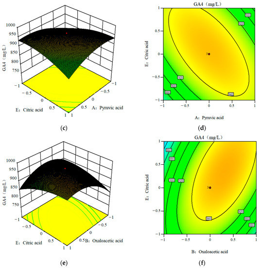 Three-dimensional response surface plots and corresponding two-dimensional contour plot showing the effects of variables and the interaction with GA4 production (mg/L); (a,b) interaction between pyruvic acid and oxaloacetic acid; (c,d) interaction between oxaloacetic acid and citric acid; (e,f) interaction between pyruvic acid and citric acid.
