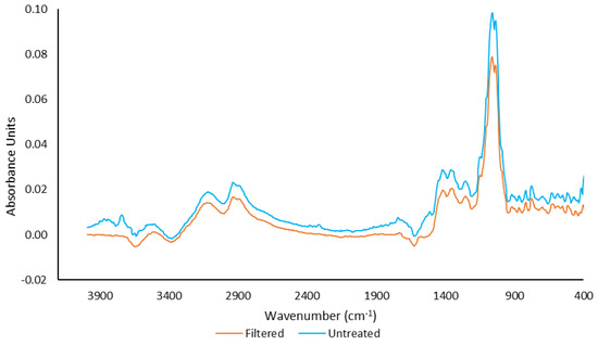 An Alpha-P Attenuated Total Reflectance Fourier Transform Mid Infrared (ATR-FT-MIR) spectrometer (Bruker Optics, Ettligen, Germany) with a 2 mm2 single bounce diamond sample plate was used to obtain the spectra in a closed environment. A resolution of 4 cm−1 was used over a range of 4000–400 cm−1 and 128 sample scans at a temperature of 30 °C were acquired. The resolution was chosen as it provided well-defined spectra whilst also allowing for time-efficient scanning. Prior to sample scanning, a background spectrum was obtained using distilled water and was repeated every 2 h. All control and selections were performed using OPUS Wine Wizard (OPUS v7.0 for Microsoft, Bruker Optics, Ettlingen, Germany). The average ATR-FT-MIR spectra for filtered and untreated samples are reported in Figure 1.