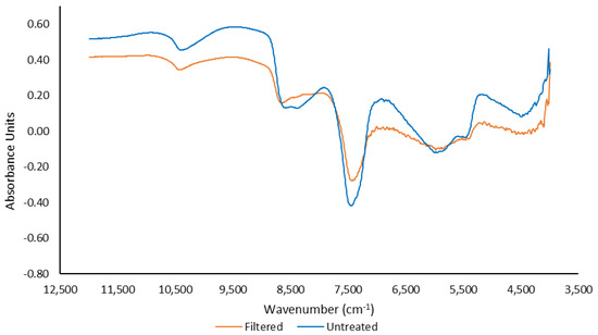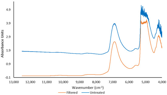 Spectra were also collected using a contactless Matrix DR-FT-NIR spectrometer in diffuse-reflectance mode (DR-FT-NIR) (Bruker Optics, Ettlingen, Germany). For sample scanning, two of the four existing tungsten bulbs (12 V, 20 W) were used with a 17 cm measuring distance. A background spectrum was obtained prior to scanning using a 20 mL volume of distilled water in a clear glass container. Sixty-four sample scans were performed over a wavenumber range of 12,500–4000 cm−1 at a resolution of 16 cm−1. The average DR-FT-NIR spectra for filtered and untreated samples are reported in Figure 3.